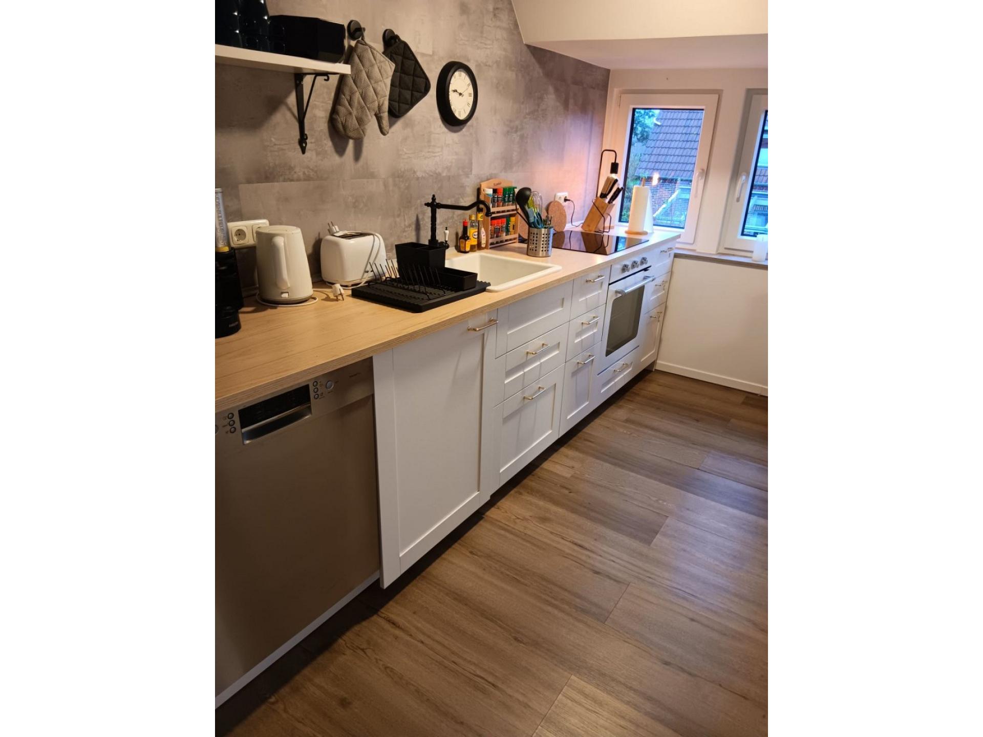 Die Küche ist mit einem Backofen, einem Kühlschrank, einem Induktionskochfeld, einer Mikrowelle und einem Geschirrspüler gut ausgestattet. Eine Grundausstattung mit Besteck, Geschirr, Töpfen, Pfannen und Schüsseln ist ebenfalls in der Küche vorhanden. Zudem sind die wichtigsten Gewürze immer zur Hand.